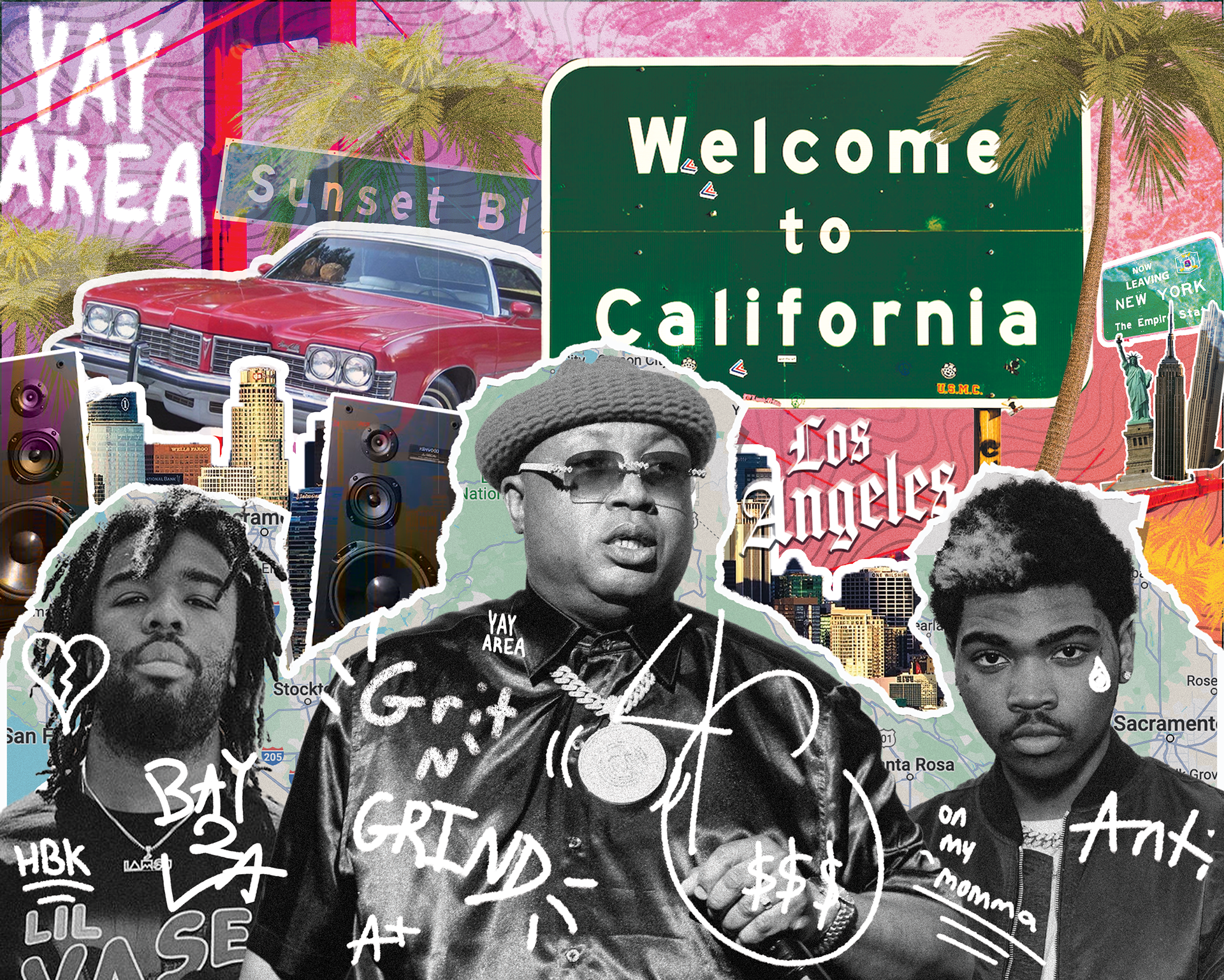 Full spread illustration for an article about the West Coast's influence on rap & Hip-hop.